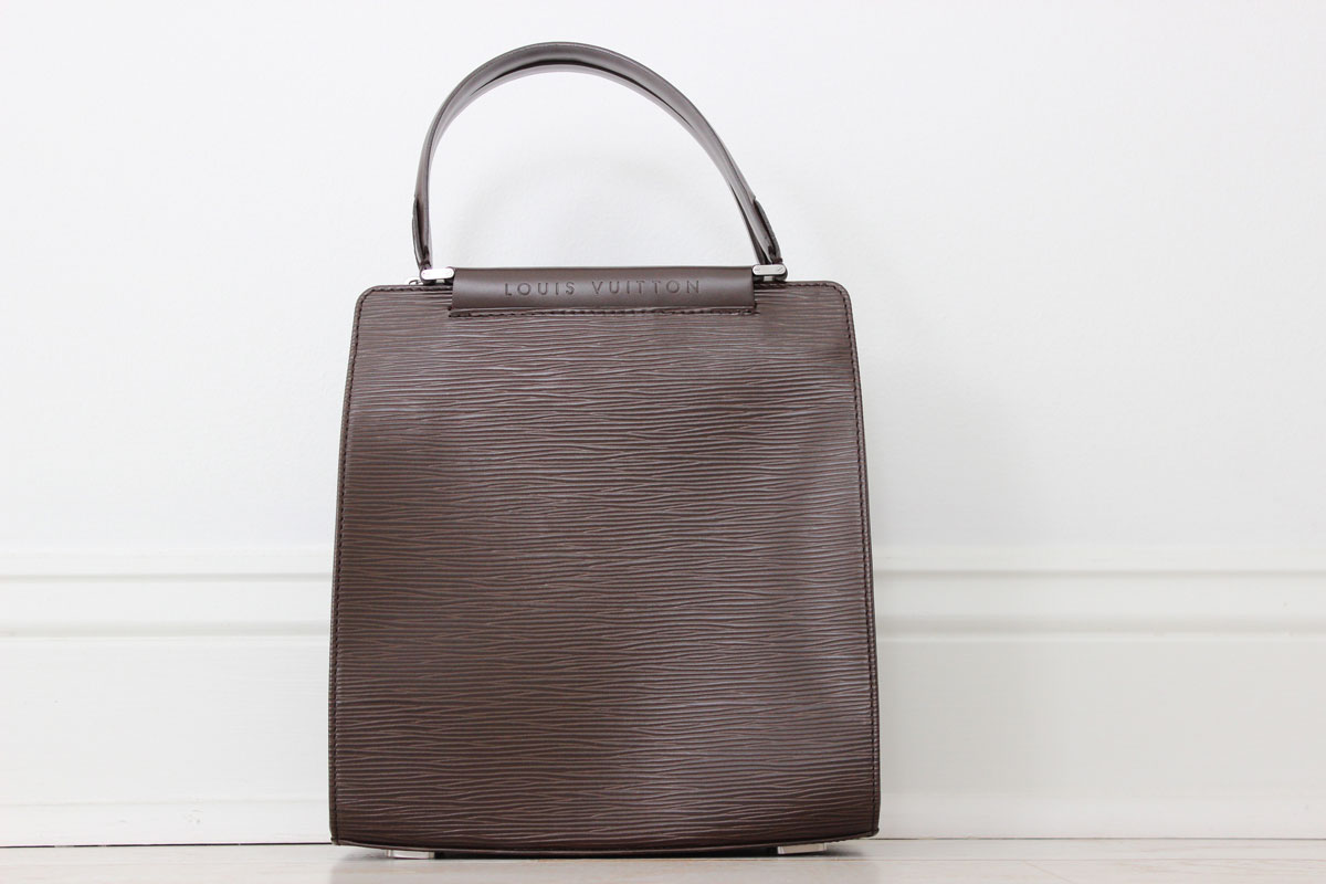 Louis Vuitton Moka Epi Leather FIGARI PM. This bag is BRAND NEW. Purchased in 2001 and never carried. Comes with dust bag. Features moka (brown) epi leather with smooth leather trim and matte silver-tone hardware. LOUIS VUITTON embossed into smooth leather trim at top. Flat handles with 4.5″ drop. Zip-top closure with side snap. Brown textile lining with zippered pocket and cell-phone pocket. Date Code/Authenticity: FL1001. Measures 9″ x 9″ x 3″. Made in France.
