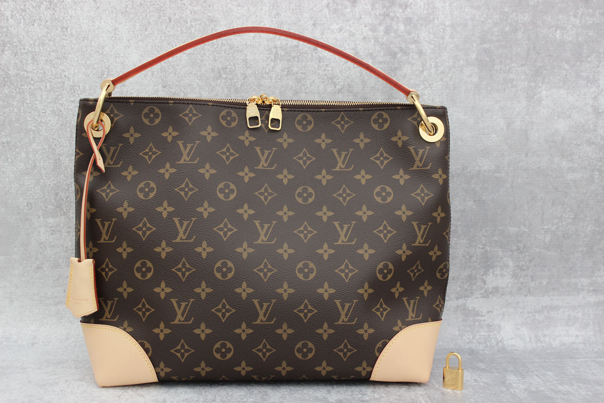 Louis Vuitton Monogram Berri PM. This shoulder bag features monogram canvas, natural cowhide trimmings, gold-tone hardware, double zip closure, detachable key clochette and textile lining with flat pocket and double smartphone pocket. Measures 15.6″ x 11.8″ x 4.7″. Made in U.S.A. Date Code/Authenticity: SD0138. This bag is in NEW condition and comes with padlock and key set, pouch for padlock, dust cover and tag.