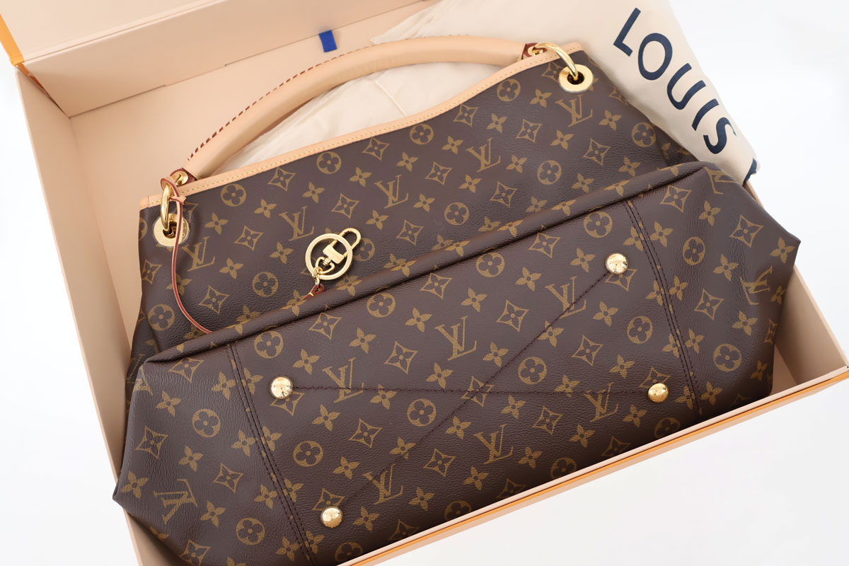 Louis Vuitton Monogram Canvas Artsy MM. Features monogram canvas with natural cowhide trim, top-stitched leather handle, gold-tone hardware, detachable key ring and hook, protective studs at the base and microfiber lining with interior zippered pocket, six flat pockets and a d-ring. Measures 16.1″ x 12.6″ x 8.7″. Made in USA. Date Code: TX3240. Comes with dust cover and box. Protective plastic still covers all the interior and exterior handle hardware as well as the interior zipper pull. There is a small water mark on the underside of the leather key strap.. a mishap that happened in our store. Please see photo with arrow pointing to mark. There are some light marks on the handle.