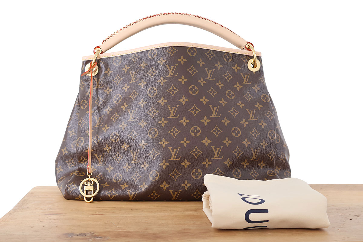 Louis Vuitton Monogram Canvas Artsy MM. Features monogram canvas with natural cowhide trim, top-stitched leather handle, gold-toned hardware, detachable key ring and hook, protective studs at the base and microfiber lining with interior zippered pocket, six flat pockets and a d-ring. Measures 16.1″ x 12.6″ x 8.7″. Made in Spain. Microchipped. This bag is brand new. Protective plastic still covers the interior and exterior handle hardware as well as the interior zipper pull. Comes with dust cover.