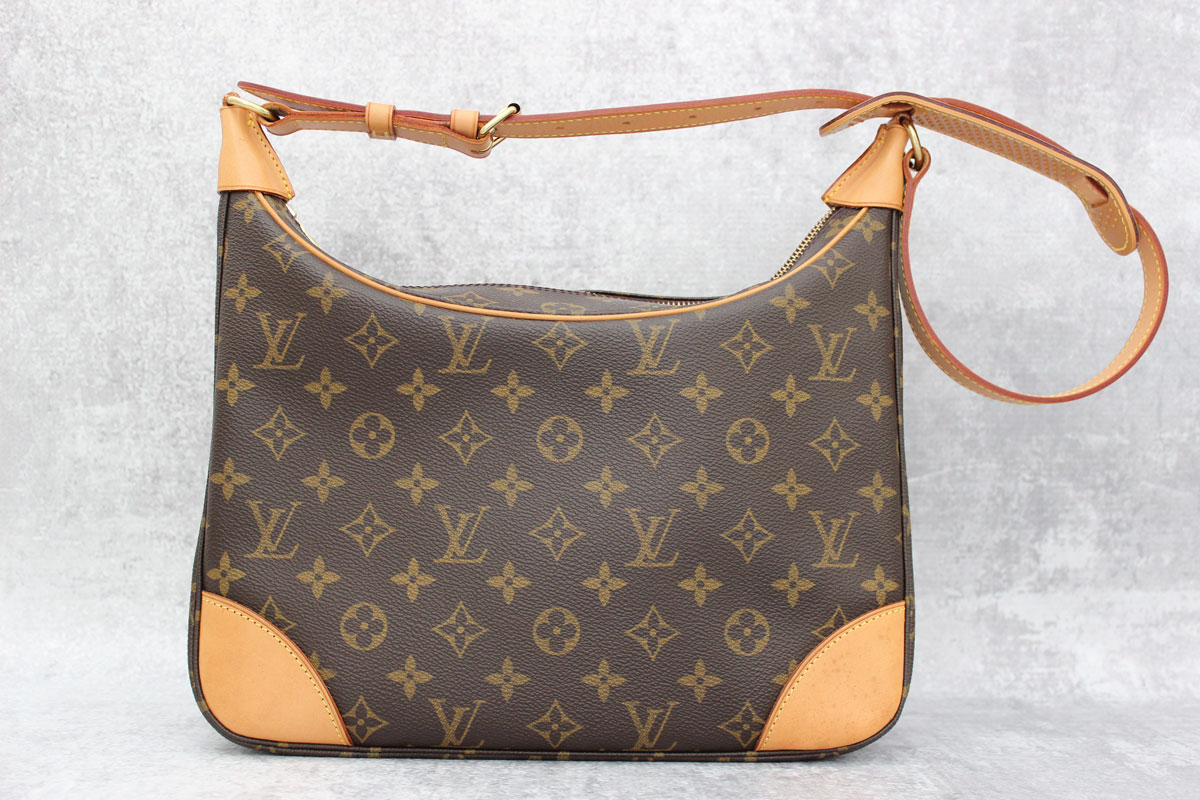 Louis Vuitton Monogram Canvas Boulogne 30 shoulder bag. Zip top, adjustable strap with removable pad, and cross-grain leather lining with zippered pocket. Measures approx. 12″ x 11.5″ x 3.5″. Made in France. Date Code: AS0013. This bag is in excellent condition but does have marks/spots on the leather trim at two of the corners and near the end of the strap (see photos). The interior is immaculate including the interior pocket, and the patina of the strap is still very light. The hardware is shiny and scratch-free. Comes with dust cover.