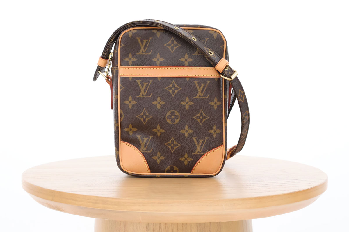 Louis Vuitton Monogram Canvas Danube. Features monogram canvas with natural cowhide trim, front slip-in pocket, zip closure, adjustable strap to wear on the shoulder or cross-body and cross-grain leather lining with pocket. Measures approx. 6″ x 8.5″ x 2″. Made in France. Date Code: TH5019. This bag is in excellent condition. There is some rubbing/marks at the four bottom corners. Otherwise immaculate inside and out.