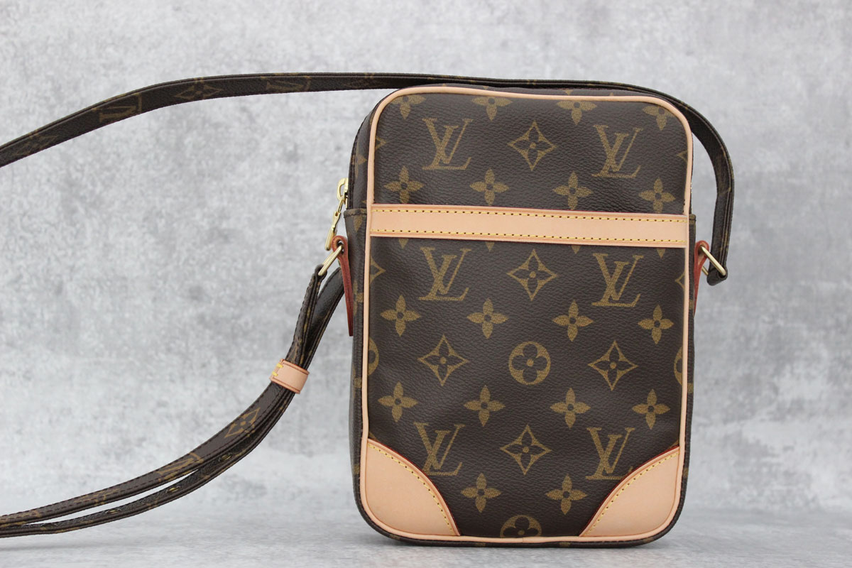 Louis Vuitton Monogram Canvas Danube Cross-Body Bag. Features monogram canvas, natural cowhide trim, zip-closure, front slip-in pocket, adjustable strap that can be worn on the shoulder or cross-body and cross grain leather lining with slip-in pocket. Measures 6″ x 8.5″ x 2″. Made in France. Date Code: TH1027. In new condition. Comes with dust cover.