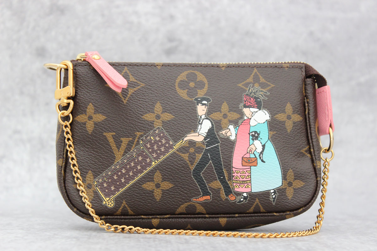Louis Vuitton Monogram Canvas Illustre Mini Pochette. This is a limited edition pochette from 2011. The whimsical design of a traveler being assisted with her Louis Vuitton luggage is printed onto the traditional monogram canvas. Rose pink accents include the zipper pull and leather tab. The gold-tone chain strap has a drop of approx. 6″. Measures 5.75″ x 3.75″ x 1.5″. Made in France. Date Code: DU2171. This Illustre pochette is brand new. Comes with shopping bag, dust cover, tag and box.