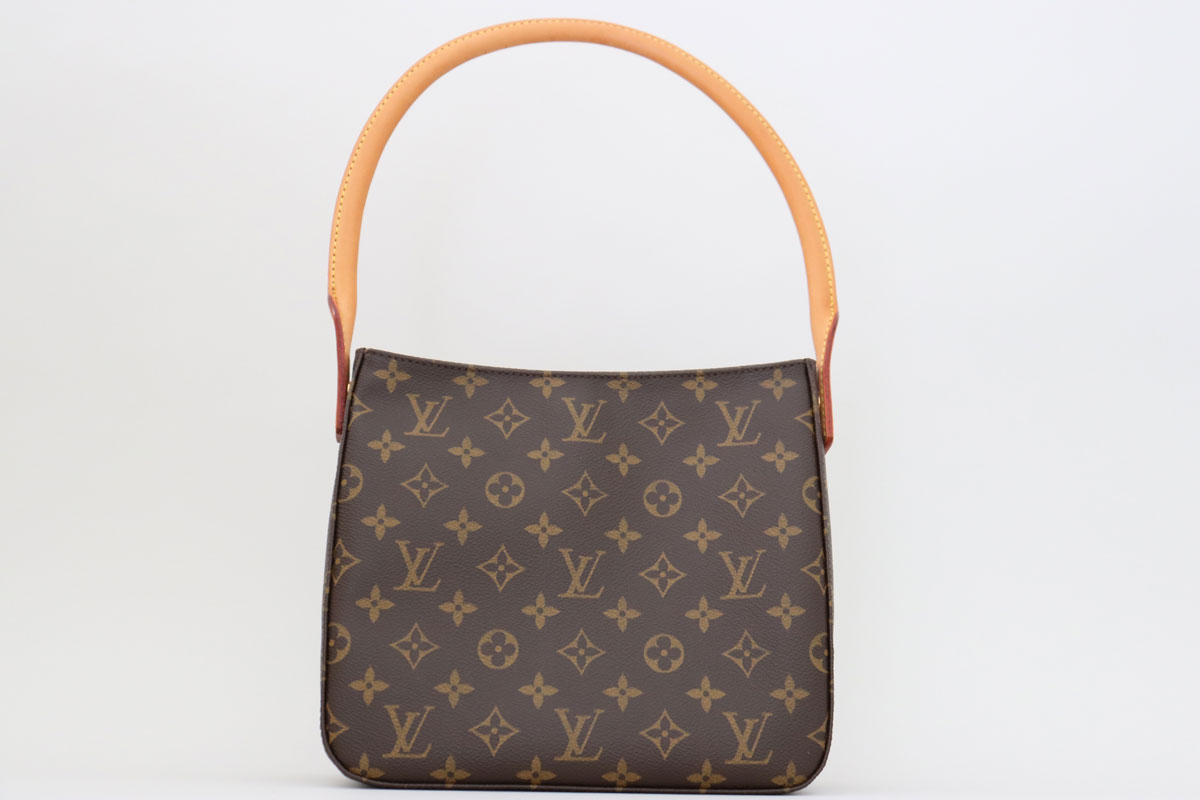 Louis Vuitton Monogram Canvas Looping MM. This bag features monogram canvas, natural cowhide swivel strap, zip-top closure and microfiber lining with zippered pocket and cell phone pocket. Measures 9.5″ x 8.5″ x 4″. The handle has a drop of 8.75″ to top of bag. Made in France. Date Code: FL0063. Excellent condition. The monogram canvas exterior and the microfiber interior are immaculate. Protective plastic still covers both zipper pulls. The handle has a nice even patina. There are some marks on the underside of the handle. Comes with dust cover.