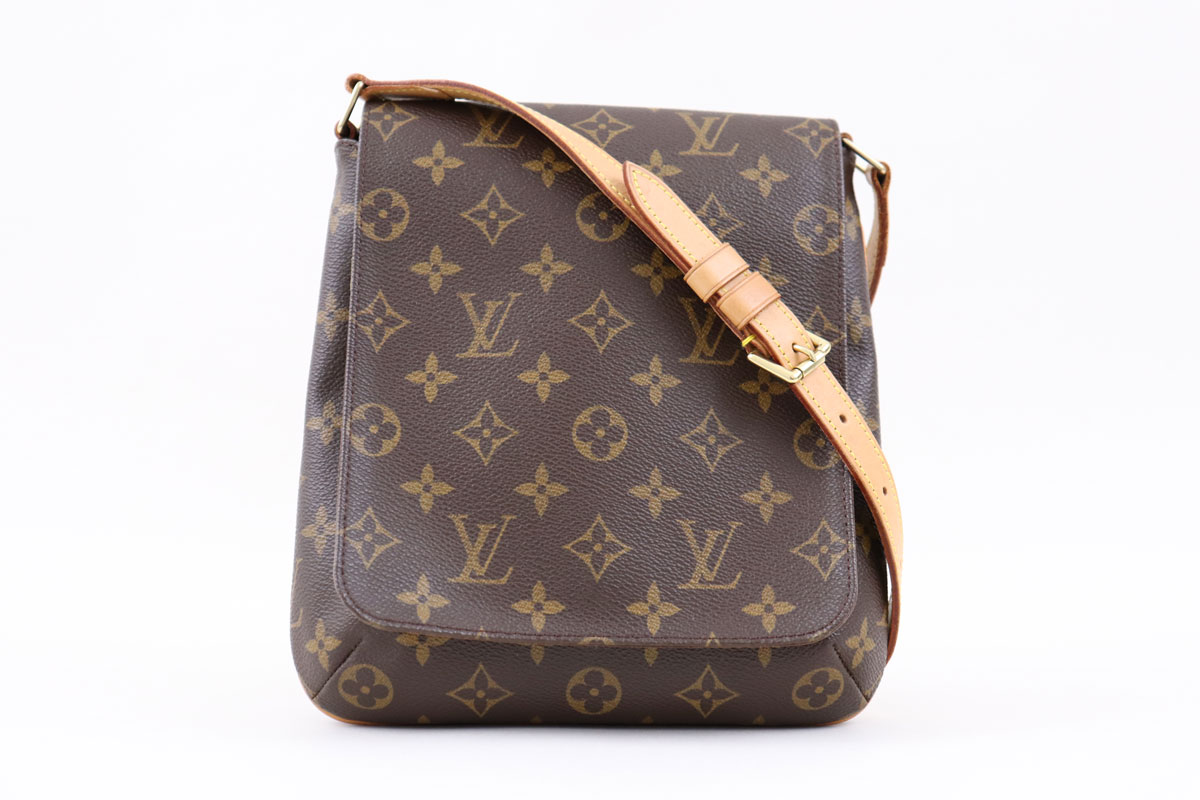 Louis Vuitton Monogram Canvas Musette Salsa. Flap front with magnetic snap closure. Alcantara lining with slip-in pocket. Adjustable shoulder strap. Strap adjusts from 10.5″ to 13.5″. Measures 9.5″ x 10″. Made in Spain. Date Code: LM0051. This bag is in very good condition. There are some marks on the strap and some rubbing on the leather piping. The interior is immaculate as is the exterior monogram canvas. No dust cover.