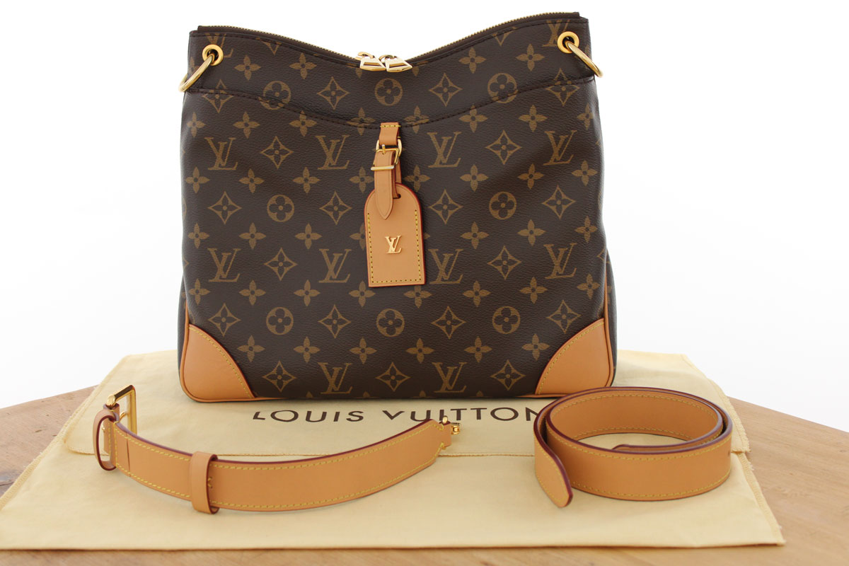 Louis Vuitton Monogram Canvas Odeon MM Natural. Monogram canvas with gold-toned hardware, semi-aged natural cowhide leather trim, double zip closure, exterior front pocket with hidden magnetic closure, removable/adjustable shoulder strap with 16.5″ to 21.7″ drop and textile lining with flat pocket. Measures 12.2″ x 10.6″ x 3.5″. Made in France. Microchip. This Odeon MM is in excellent condition and comes with dust cover. There is light rubbing to the piping at 2 of the bottom corners and a light rub mark on the luggage tag strap. Protective plastic still covers part of strap buckle.