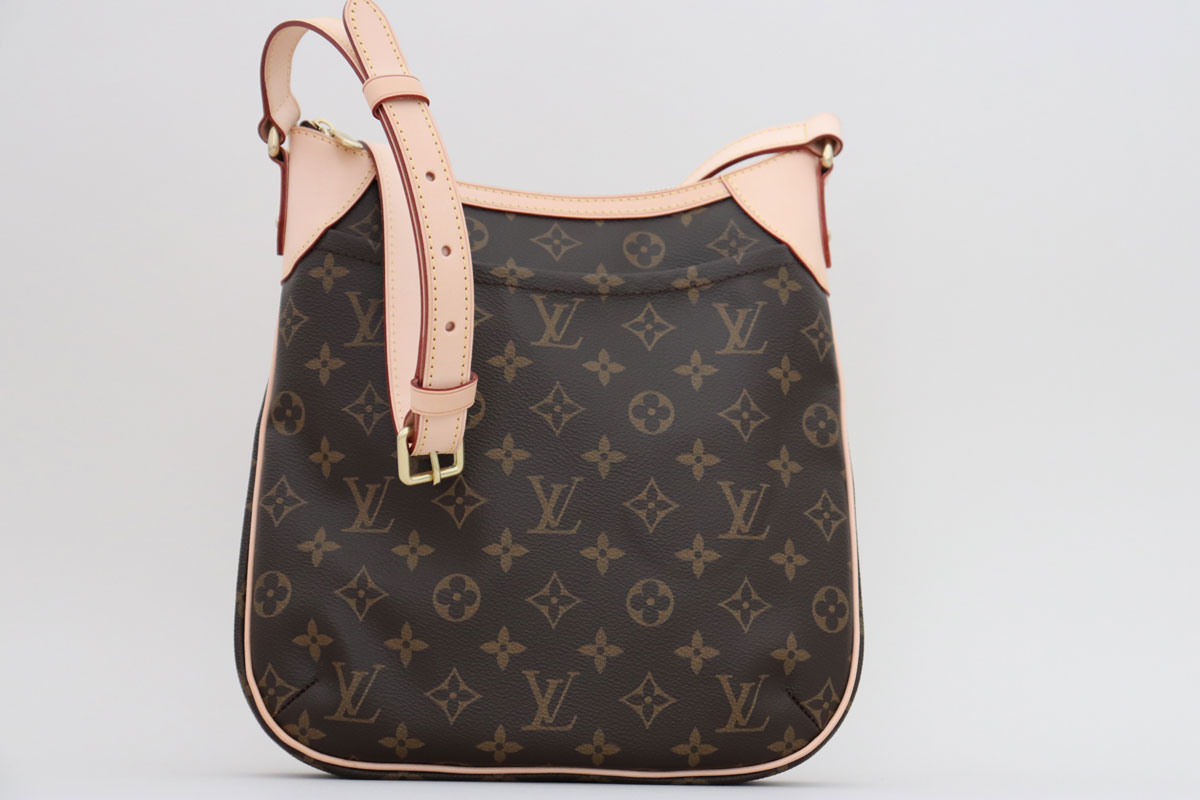 Louis Vuitton Monogram Canvas Odeon PM. Features monogram canvas, natural cowhide trim, gold-tone hardware, adjustable strap to wear on the shoulder or cross-body, zip-top closure, front exterior pocket and textile lining with two slip-in pockets. Measures 10.2″ x 11.5″ x 2″. Made in Spain. Date Code: CA4141. This Odeon PM is brand new and comes dust cover.