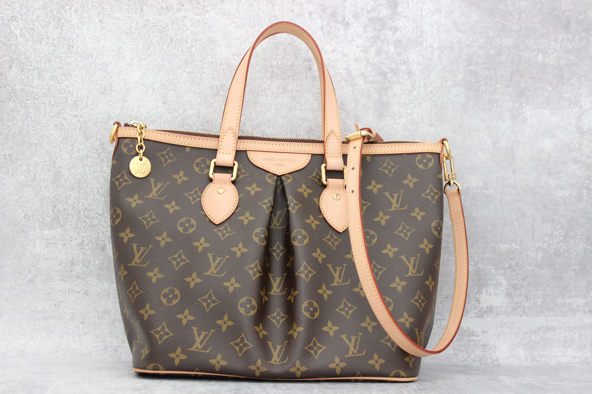 Louis Vuitton Monogram Canvas Palermo PM. Features monogram canvas, natural cowhide trim, golden brass hardware, zip-top closure, flat leather handles and a detachable, adjustable shoulder strap. Textile lining with d-ring, three flat pockets and a cell pocket. Measures 11.5″ across base (14.5″ across top) x 11″ x 6.25″. Made in U.S.A. Date Code/Authenticity: SD4171. This bag is in MINT condition inside and out and comes with dust cover and box.