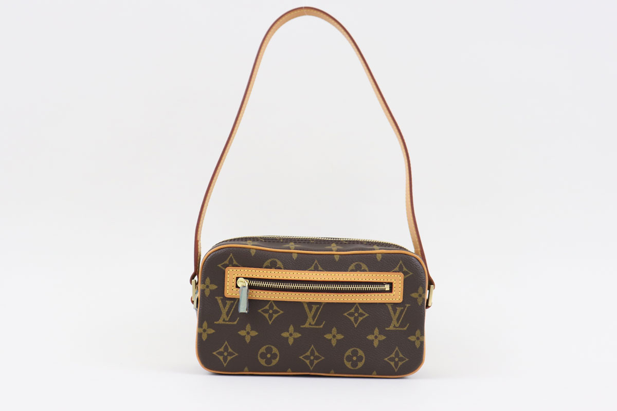 Louis Vuitton Monogram Canvas Pochette Cite. This pochette cite bag features monogram canvas, a front zippered pocket, zip-top closure, shoulder strap with 10″ drop to top of bag and cross-grain leather lining with slip-in pocket. Measures 8″ x 4.75″ x 2.25″. Made in USA. Date Code: SD0013. Brand New. Comes with dust cover.
