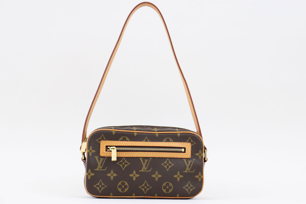 Louis Vuitton Monogram Canvas Pochette Cite. This pochette cite bag features monogram canvas, a front zippered pocket, zip-top closure, shoulder strap with 10″ drop to top of bag and cross-grain leather lining with slip-in pocket. Measures 8″ x 4.75″ x 2.25″. Made in U.S.A. Date Code: SD0013. No dust cover.