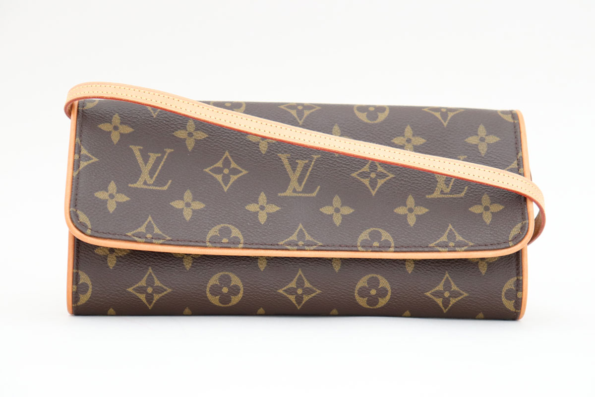 Louis Vuitton Monogram Canvas Pochette Twin GM. This bag can be worn three ways. Unsnap the strap and carry as a clutch, attach the strap and wear long on the shoulder or double the strap to wear short on the shoulder. At the longest length the strap has a drop of approx. 19.5″. The interior is lined in microfiber and has a single flat pocket. Measures 9.5″ x 4.5″ x 1″. Made in USA. This bag is in excellent condition and comes with dust cover. The leather trim has a darkened patina. The strap is still nice and light. The interior and exterior are immaculate.