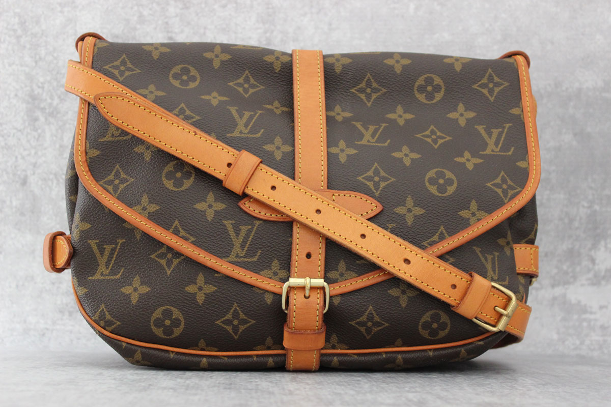 Louis Vuitton Monogram Canvas Saumur 30. This saddle-style bag features monogram canvas, natural cowhide trim, adjustable shoulder strap with removable pad and textile lining. Can be worn on the shoulder or cross-body. There are two main compartments, each with a buckle closure. One compartment has a slip-in pocket. Measures 11.5″ x 8.5″. Both compartments have a depth of approx. 2.75″. Made in France. Date Code/Authenticity: VI0932. The leather trim shows normal wear: darkening, marks, creasing. The interior compartments are immaculate as is the exterior canvas. No dust cover.