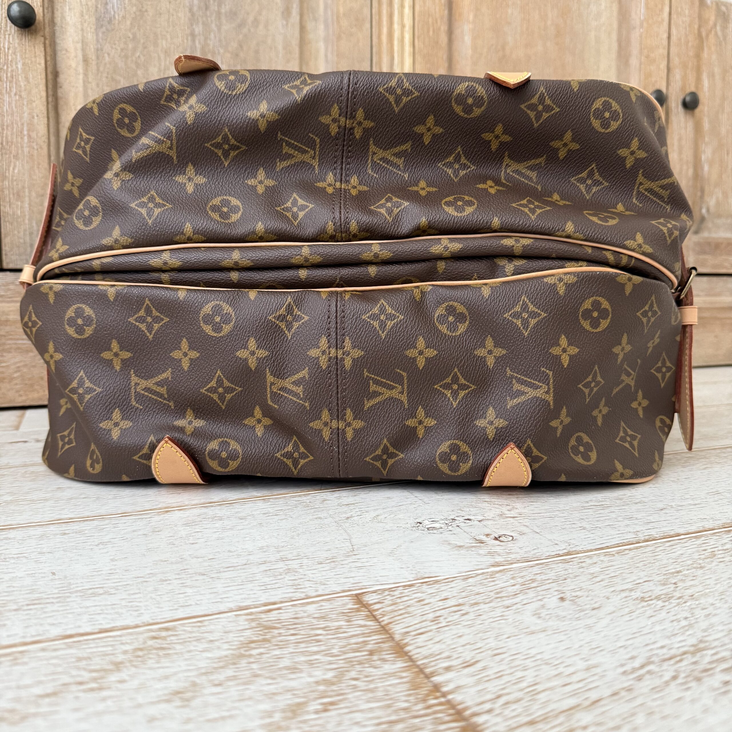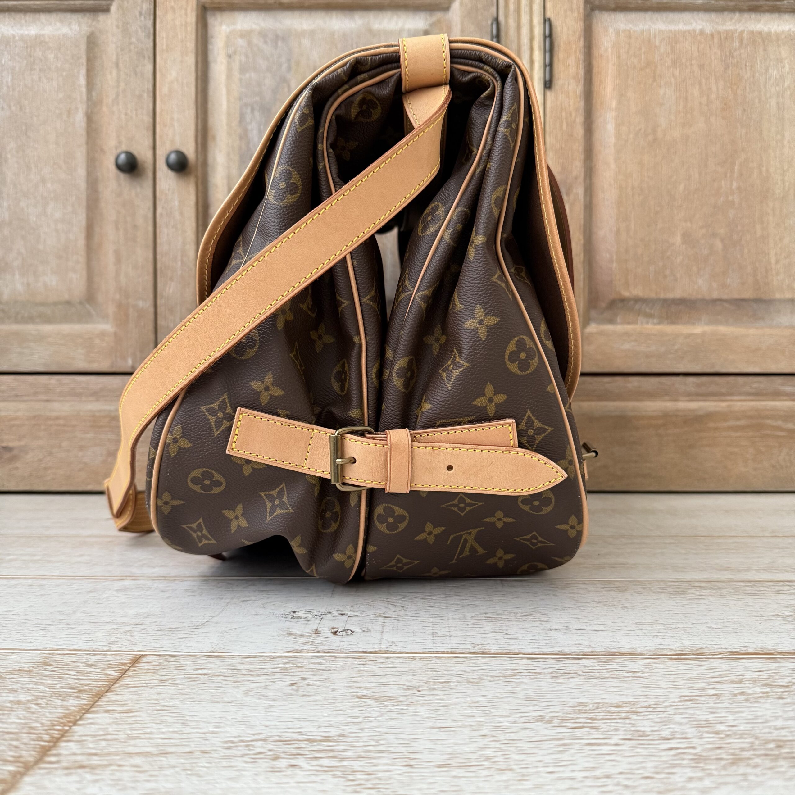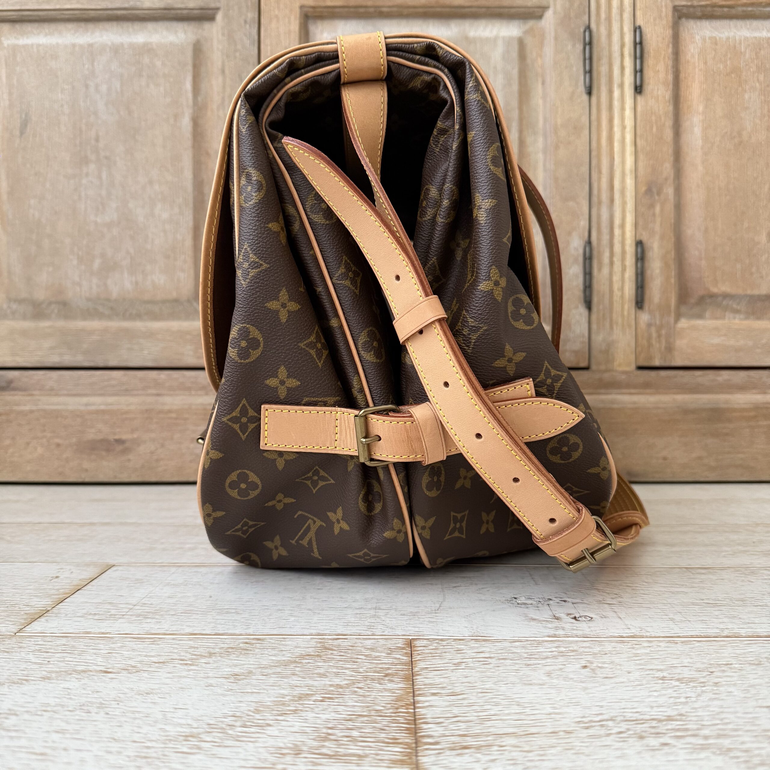 Louis Vuitton monogram canvas Saumur 43. Vintage double-sided bag featuring monogram canvas with natural cowhide trim, brass hardware, adjustable shoulder strap with pad and buckle closures. Measures approximately 16.5” x 11.5” x 10.5”. Made in France. FH0950. This vintage Saumur is in pristine condition.