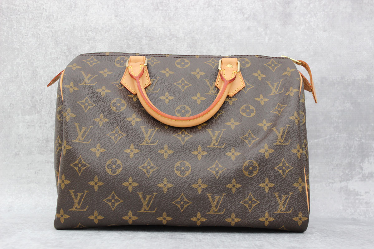 Louis Vuitton Monogram Canvas Speedy 30. This Speedy bag features monogram canvas, natural cowhide trim, rolled leather top handles, zip-top closure and textile lining with patch pocket and d-ring. Measures 11.8″ x 8.3″ x 6.7″. Made in France. Date Code: TH1023. There are some marks on the undersides of the handles. The tops of the handles look great. The interior is immaculate and the monogram canvas exterior is immaculate. No dust cover. Will be packaged with care. Please note: this bag will ship flat and folded just as it does when it comes from Louis Vuitton.
