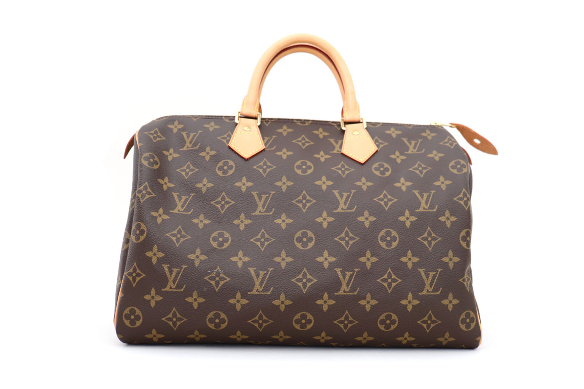 Louis Vuitton Monogram Canvas Speedy 35. Features monogram canvas, natural cowhide trim, gold-tone hardware, rolled leather top handles, zip closure and textile lining with pocket and d-ring. Measures 13.8″ x 9.1″ x 7.1″. Made in USA. This bag is in excellent condition and comes with dust cover, padlock and key set. There are some light marks on the leather trimmings and a small white mark on the interior.