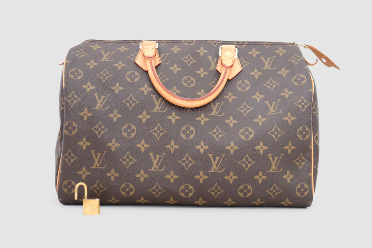 Louis Vuitton Monogram Canvas Speedy 35. Features monogram canvas, natural cowhide trim, rolled leather top handles, zip top closure and textile lining with d-ring and pocket. Measures 13.8″ x 9.1″ x 7.25″. Made in USA. Date Code: SD3171. There are ink marks on the interior. The monogram canvas is in excellent condition. The handles have darkening/marks. The hardware has scratches. Comes with lock (unlocked-no key). No dust cover.