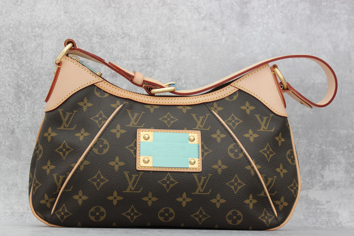 Louis Vuitton Monogram Canvas Thames PM. Features monogram canvas, natural cowhide trim, gold-tone hardware, Inventeur plaque, zip-top closure, adjustable shoulder strap and textile lining with flat pocket and cell pocket. Strap adjusts from a drop of 9″ – 10″. Measures 12.75″ x 8.5″ x 2.5″. Made in France. Date Code: AR2069. This bag is brand new. Protective plastic still covers most of the hardware. Comes with tag and dust cover.