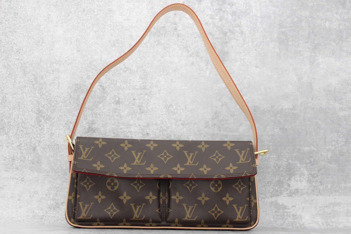 This Viva Cite MM bag features monogram canvas, natural cowhide strap with adjustable drop, two magnetic-snap pockets at the front, a zip-top closure and raspberry microfiber lining with two flat pockets. Measures 12″ x 5.25″ x 3.5″. Date Code: AR1047. Made in France. Like new. Comes with dust cover. Protective plastic still covers the magnetic snaps on the front pockets.