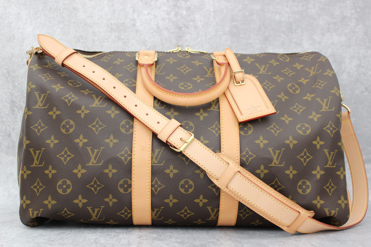 Louis Vuitton Monogram Keepall 45 Bandouliere. This cabin-sized Keepall features monogram canvas, natural cowhide trim, rolled leather top handles, double zip closure, adjustable and detachable shoulder strap and removable ID tag. Measures 17.7″ x 10.6″ x 8″. Made in France. Date Code/Authenticity: MB0091. Excellent condition. Gently carried only a few times. The strap looks new. There is a water mark on the leather at the base and some light markings to the top handles and the leather trim on the sides. Interior is immaculate. Comes with dust cover. Please note: we don’t have the keys for the lock. The lock is attached to the d-ring on the interior. It can be cut or Louis Vuitton may be able to offer a replacement key. This bag will ship flat and folded.