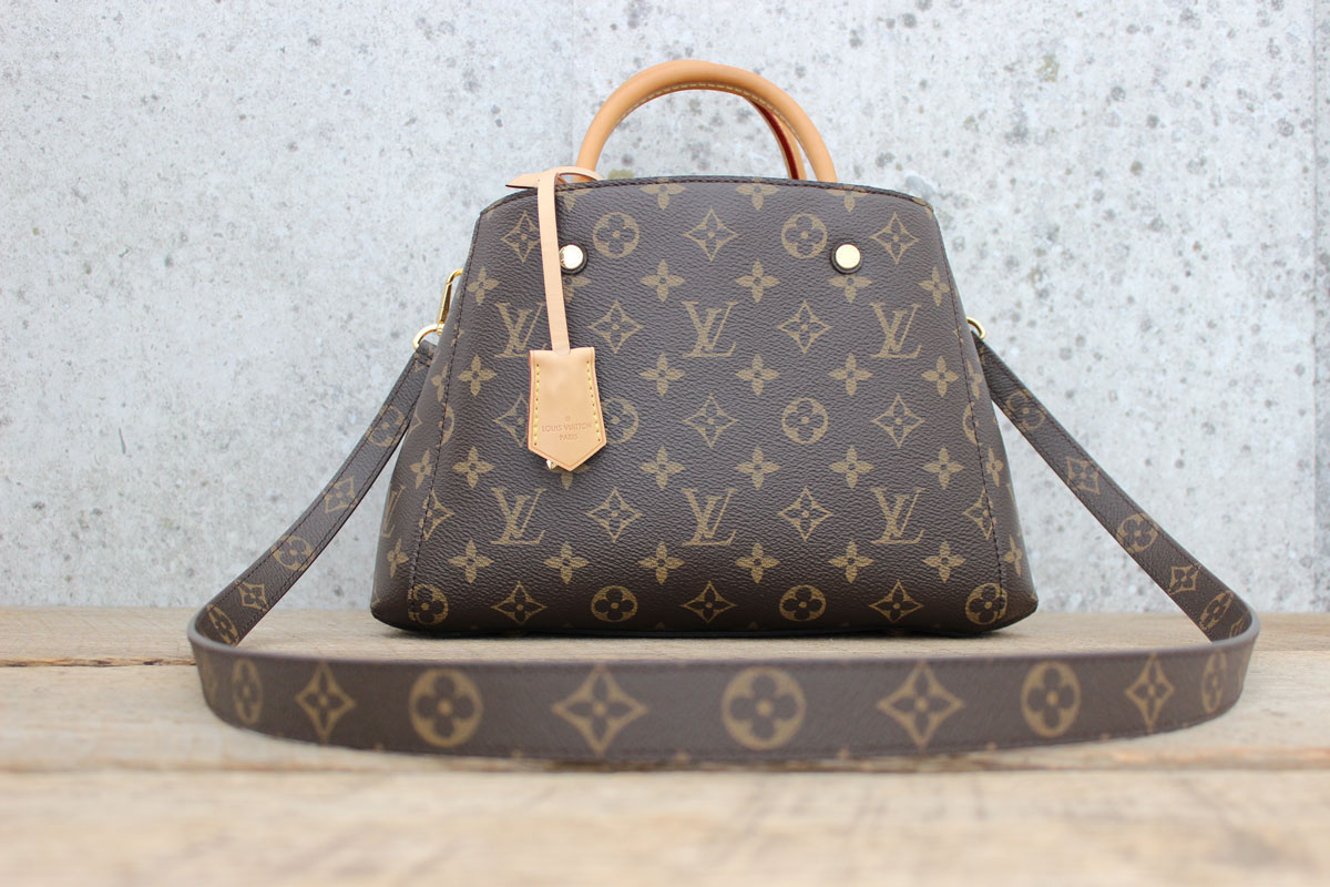 Louis Vuitton Monogram Canvas MONTAIGNE BB Bag. Monogram canvas, natural cowhide trim, golden brass hardware, rolled leather handles, detachable shoulder strap, key clochette with two keys and burgundy microfiber lining with center zippered compartment with padlock, two wide compartments, one double BB pocket and one flat pocket. Interior clip closure. Large Louis Vuitton engraved studs protect the base. Hand, arm or cross-body carry. This bag is in PRISTINE condition and comes with dust cover. The handles show a light patina and light wear. The key clochette is lighter because it was kept inside the bag and not used. The interior is immaculate. The strap is perfect and there is zero rubbing or marks anywhere on the monogram canvas. Only the top handles show light wear. Date Code: SD1184. Measures 11.4″ x 7.9″ x 5.1″. Made in U.S.A.