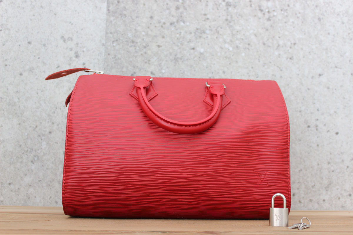 Louis Vuitton Red Epi Leather SPEEDY 25 W/Silver Hardware. This bag is new and comes with padlock, key set, dust cover and tags. Red epi leather with smooth leather trim, shiny silver-tone hardware, zip top, rolled leather handles, LV embossed at bottom corner and red textile lining with d-ring and two flat pockets. Measures 11″ x 7.5″ x 6″. Date Code/Authenticity: SP3007. Made in France. There is a tiny white mark that you can see in photo number 8 if you zoom in.