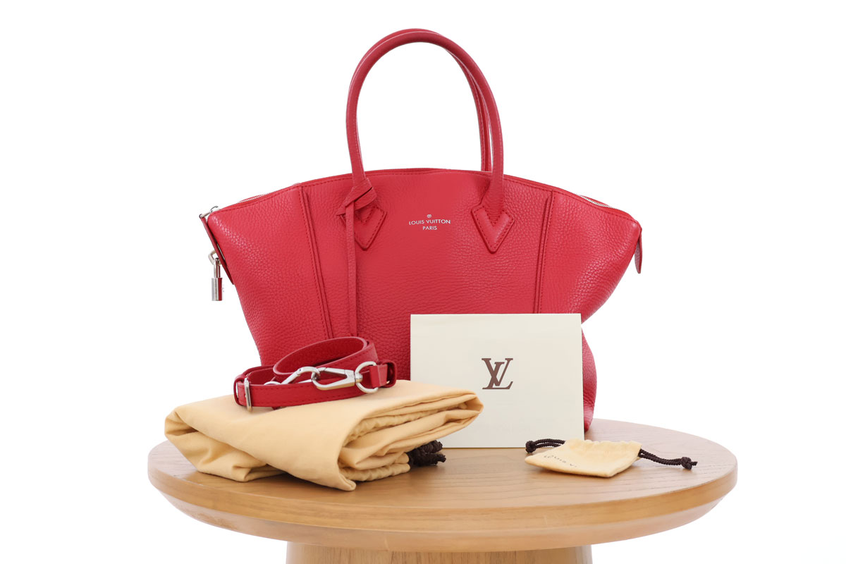 Louis Vuitton Red Taurillon Leather Soft Lockit PM. Silver-toned hardware. Zip-closure. Studs to protect the base. Rolled leather top handles. Detachable, adjustable shoulder strap. Suede lining. Can be carried as a tote or worn on the shoulder. Comes with dust cover, original receipt, padlock, keys and key clochette. Measures 11″ across the base, x 10″ x 5″. Made in Italy. Date Code: PL 2115. There are rub marks at the four bottom corners. There are some black rub marks at the base and near where the shoulder strap attaches. There are some scratches to the feet at the base. There are some marks on the handles.