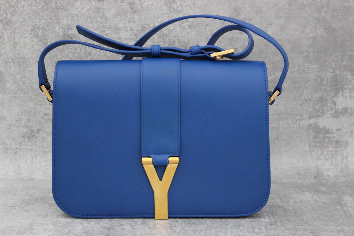 Saint Laurent Blue Calfskin Medium ChYc Flap Bag. This stunning Saint Laurent bag features blue, smooth calfskin leather, gold-tone ‘Y’ hardware, adjustable shoulder strap to wear on the shoulder or cross-body, two interior compartments, blue suede lining and a zippered pocket. Serial/Authenticity: GNR311214 1213. Measures 9.5″ x 6.5″ x 2.5″. Made in Italy. This bag is in BRAND NEW condition and comes with dust cover.