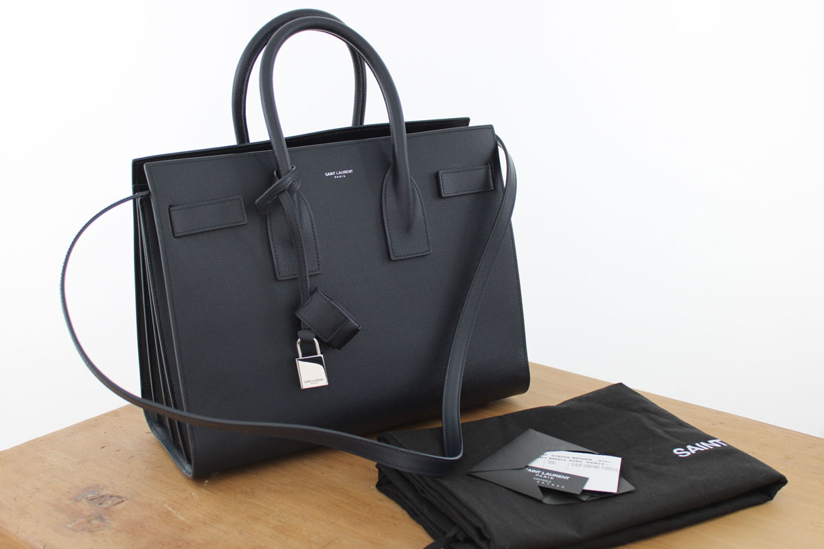 Saint Laurent Small Navy Grained Leather Sac De Jour. Navy grained leather with silver-toned hardware. Detachable shoulder strap, removable padlock charm and key set that snaps onto the interior wall. Side snaps can be unsnapped to increase depth. Measures 12.5″ x 10″ x 6″. Made in Italy. 378299. This bag is in like new condition and comes with dust cover and tags. There are minor scratches on the studs that protect the base.