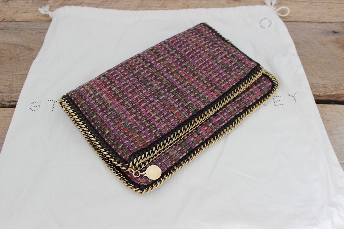 Stella McCartney Falabella Boucle Tweed Foldover Clutch. Antiqued gold metal chain. Style/Authenticity/Season: 278014 W9190 495151 FW12. Measures 11.5″ x 7.5′. Made in Italy. This tweed falabella clutch is in LIKE NEW condition with dust cover.