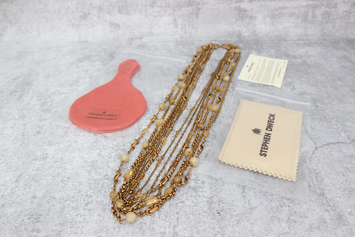 Stephen Dweck beautiful multi-chain, multi-stone necklace. This necklace is long! It measures 37″ from end of clasp to end of clasp. Signed Stephen Dweck. It is pre-owned but looks un-worn and comes with Stephen Dweck pouch, polishing cloth and card. I do not know what the stones are. I think they are citrine and chalcedony, carved quartz and rutilated quartz. Retail was $1,295.