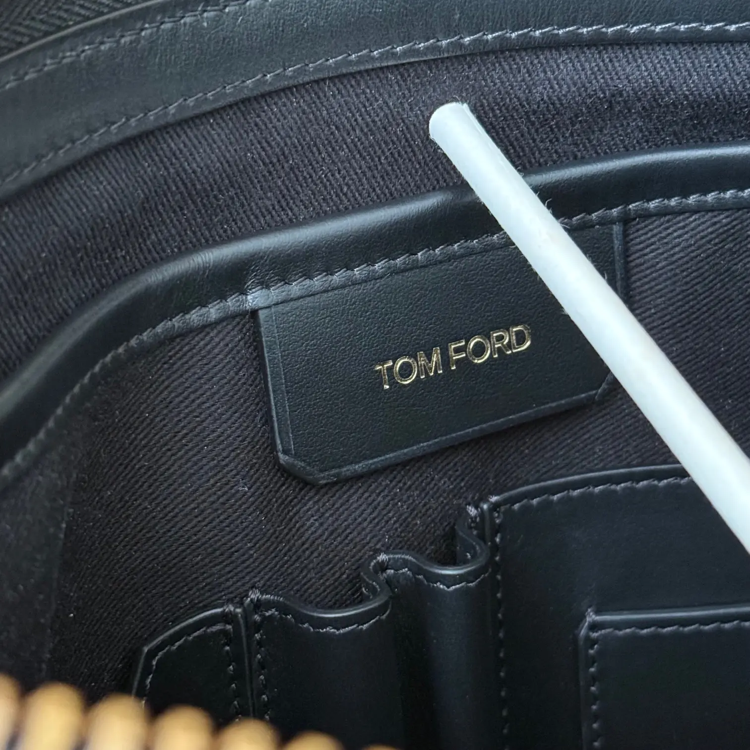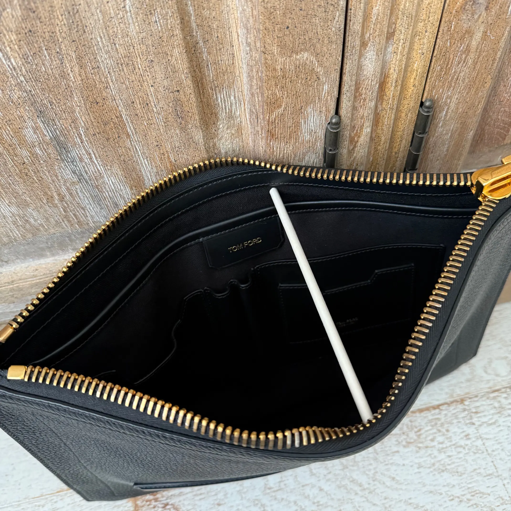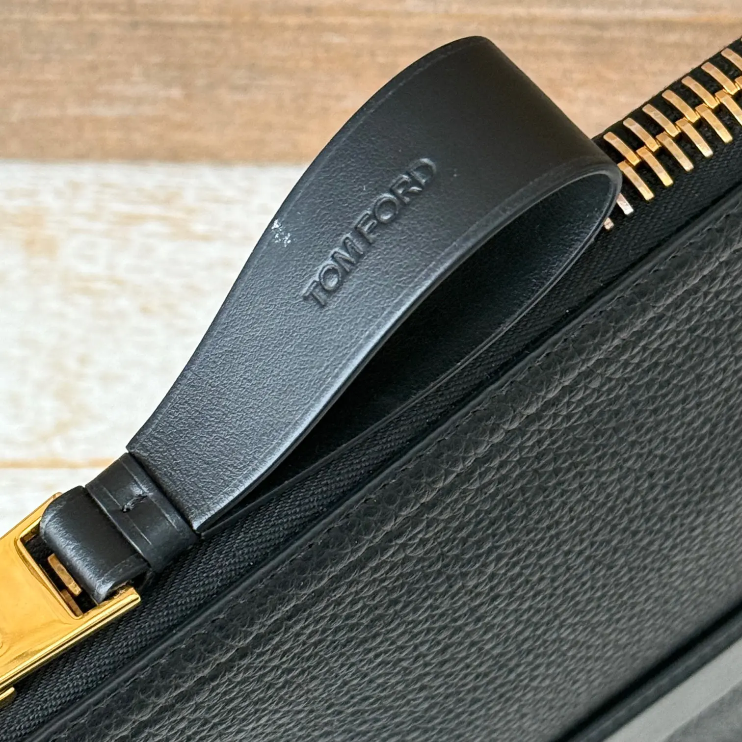Tom Ford black leather portfolio. Features soft grain leather with embossed Tom Ford at front and a slip-in handle on front. Gold-toned hardware. Zip closure. Black canvas lining with three open compartments including the center, cell pocket, two pen pockets and two additional flat pockets. Measures 15″ x 10.5″. Made in Italy. This portfolio/document case has not been carried. There is a small white mark on the zipper pull.