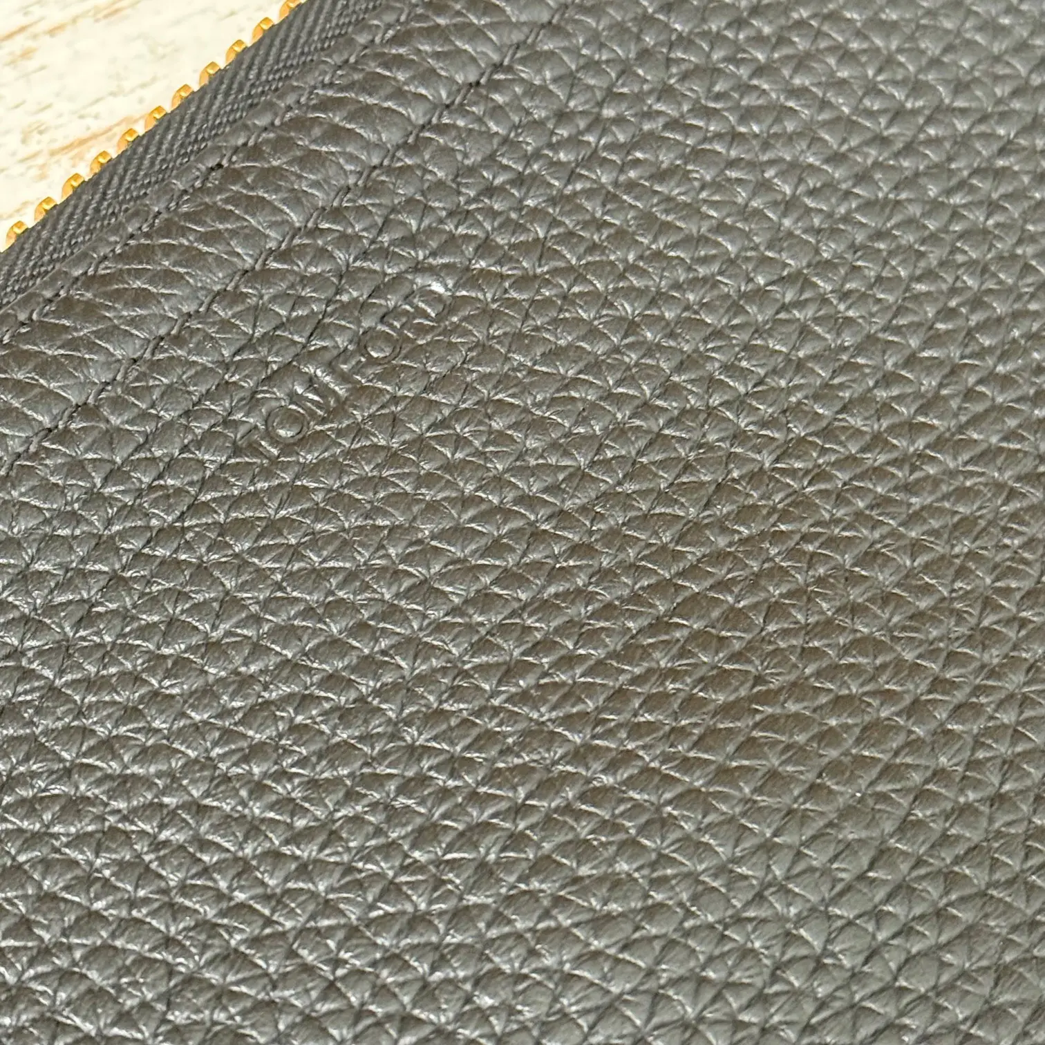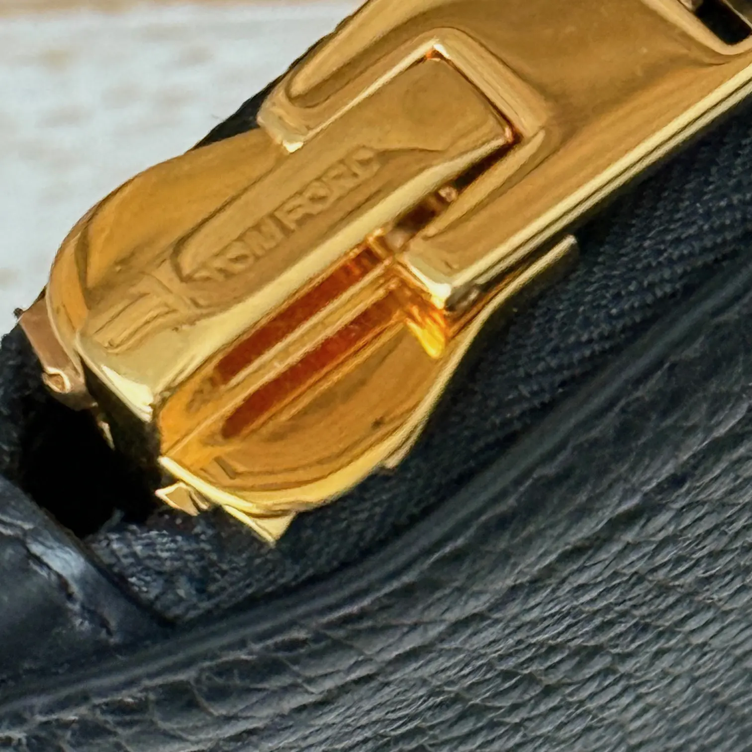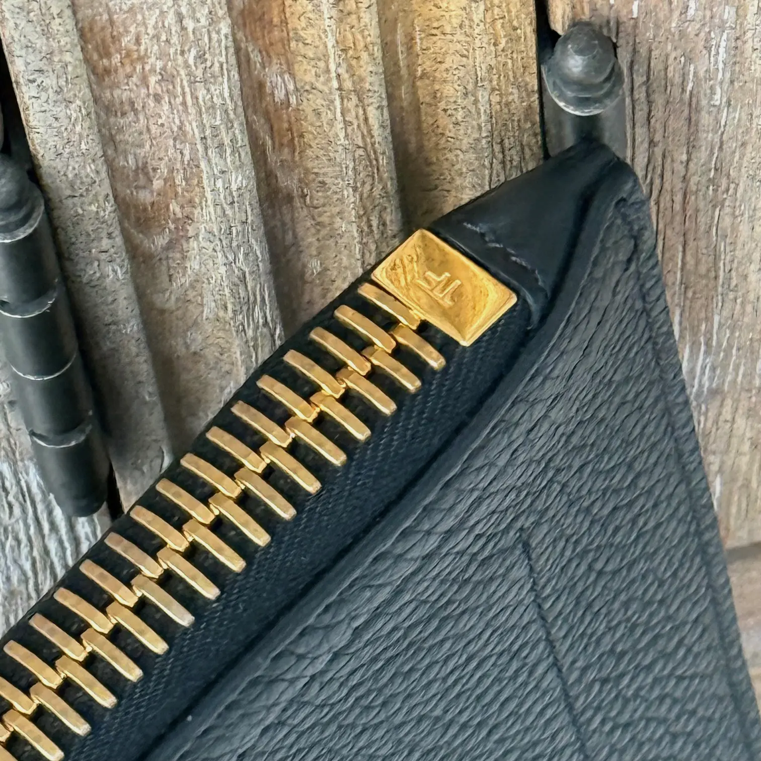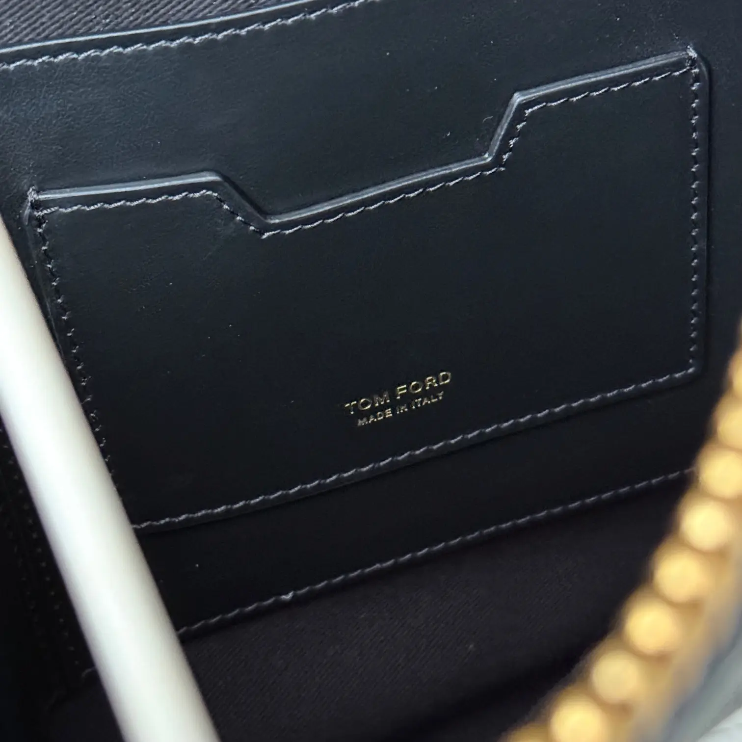Tom Ford black leather portfolio. Features soft grain leather with embossed Tom Ford at front and a slip-in handle on front. Gold-toned hardware. Zip closure. Black canvas lining with three open compartments including the center, cell pocket, two pen pockets and two additional flat pockets. Measures 15″ x 10.5″. Made in Italy. This portfolio/document case has not been carried. There is a small white mark on the zipper pull.