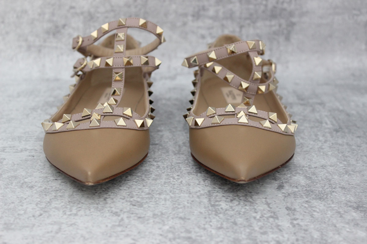 Garavani Natural Rockstud Caged T-Strap Ballerina Flats. Size 39. These are NEW WITH DEFECTS BUT THE DEFECT IS TINY. There is a tiny mark on the inside of the right heel (can’t be seen when wearing) and a tiny scratch on the exterior of the heel (see photos 9 & 10). No box but they will come with dust cover.