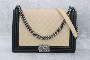 Chanel Beige & Black Large Boy Quilted Flap Bag