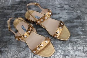 Prada Crystal Embellished Gold Leather Slingback Sandals 7